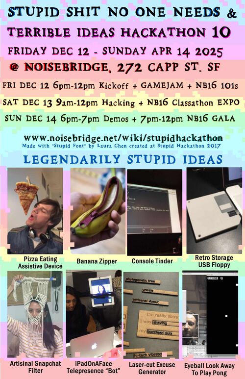 Stupid Stuff No One Needs & Terrible Ideas Hackathon is an opportunity to make the weirdest possible stuff. NEXT EVENT: Stupid Hackathon 10 @ NB16 Dec 12, 13 & 14th! Volunteer to help organize and sponsor it. LAST EVENTS: Stupid Hackathon 9]] & Stupid Hackathon 8 @ NB14 |